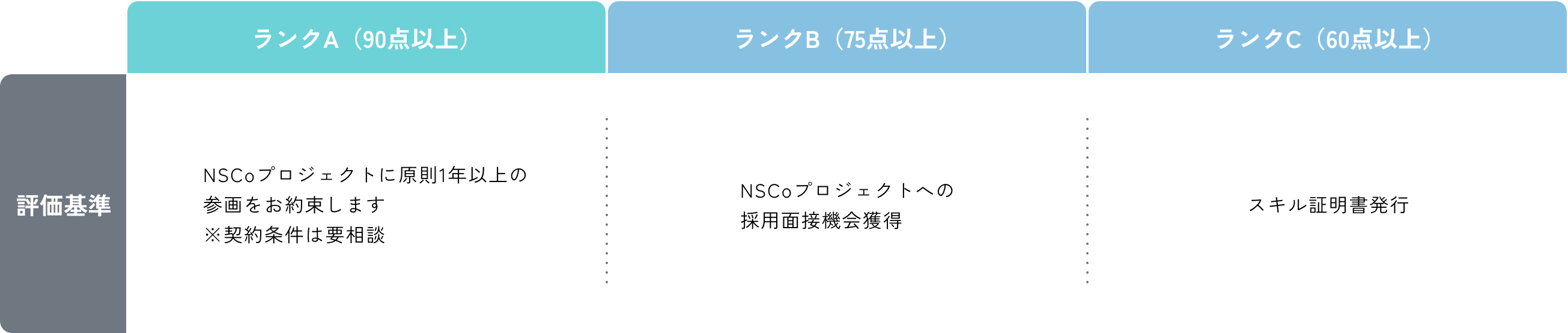 試験結果や類似プロジェクトでの成果に応じて、当社の実際のプロジェクトへの参画を保証する制度をご用意しています。